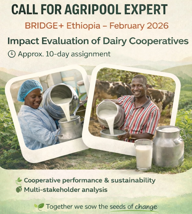 Prestatiebeoordeling van melk coöperaties. Eén agriterra opdracht van ongeveer tien dagen bij voorkeur van 15 tot 25 februari 2026 bij het BRIDGE+ project. Agriterra zoekt één agripool expert voor het ondersteunen en medeuitvoeren van een verdiepend assessment in de prestaties van melkcoöperatie en hun succesfactoren in Ethiopië.